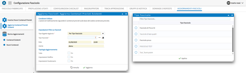 Aggiorna Contenuti Previsti Esistenti Per Tipo Fascicolo