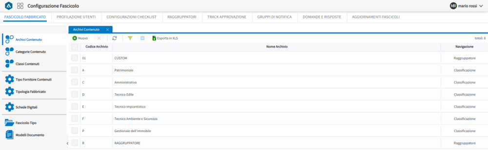 Dal menù “Fascicolo Fabbricato”, accedere alla sezione “Archivi Contenuto”. Cliccare sul pulsante “Esporta in XLS”. Il sistema genera un file Excel con la lista completa degli archivi, disponibile nella cartella di download del proprio dispositivo.