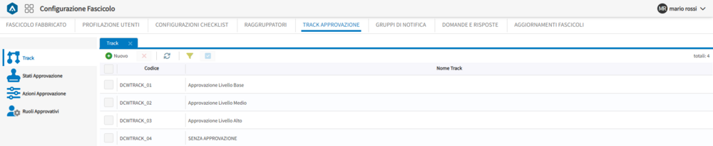 Selezionare il menù di primo livello “Track Approvazione”. Accedere alla voce “Track”. Dall’elenco disponibile, individuare la track a cui si vuole aggiungere uno stato e aprirne il dettaglio. Nella parte bassa della schermata, cliccare sul pulsante “Nuovo” presente nella sezione “Stati”. Compilare i campi richiesti nella maschera di inserimento, quindi cliccare su “Crea e Chiudi”. Il nuovo stato sarà aggiunto alla track selezionata e apparirà nell’elenco sottostante.