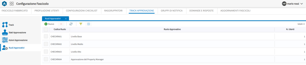 Selezionare il menù di primo livello “Track Approvazione”. Selezionare il menù di secondo livello “Ruoli Approvativi”. Cliccare il pulsante “Nuovo” in alto a sinistra. Inserire i dati richiesti nel form di creazione. Cliccare il pulsante “Crea e Chiudi”. Al termine dell’operazione, viene creato un ruolo approvativo.